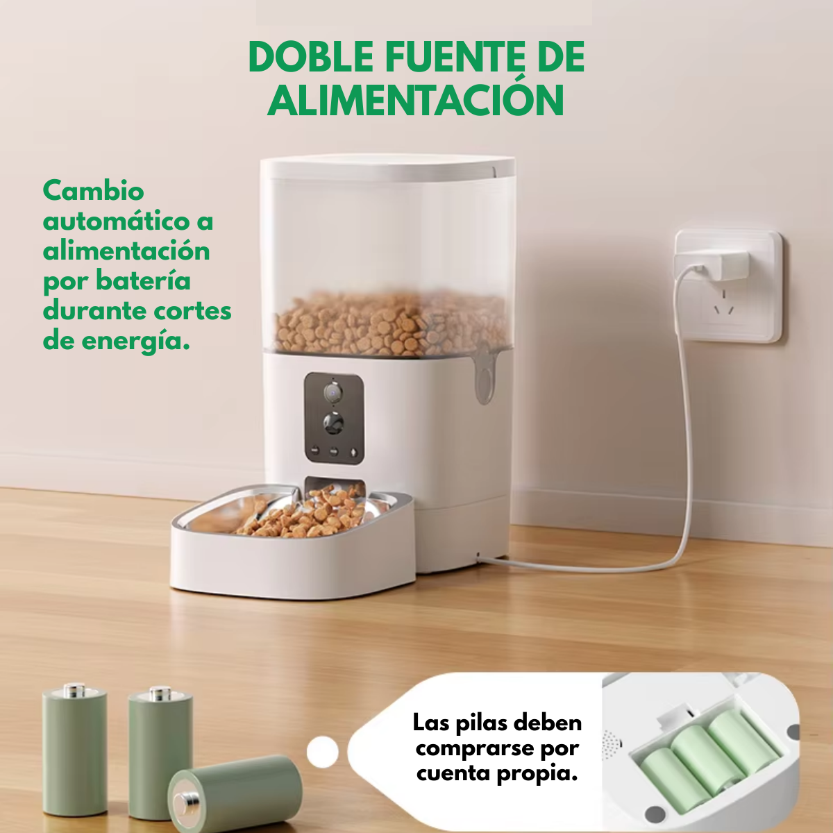 Funciona con cable de corriente, y además cuenta con opción de baterías para garantizar el suministro de comida incluso en fallos eléctricos. ¡Tu mascota siempre estará cuidada!